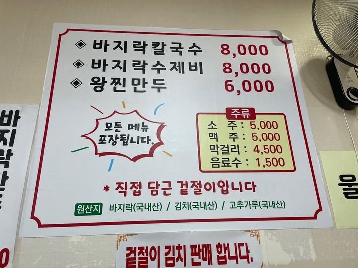 역시 맛집은 잡다한 메뉴가 있다기보단 몇 가지의 단일 메뉴만 판매하고 있는 것이 국룰입니다. 바지락 칼국수와, 수제비, 그리고 왕찐만두 딱 3가지 메뉴만 판매하고 있습니다.