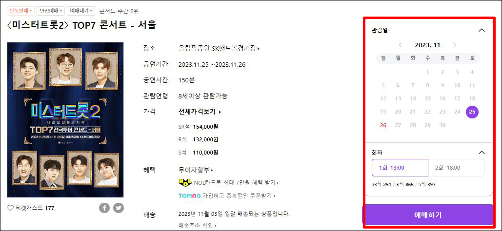 ② 예매 페이지로 이동 → 우측 관람일 선택 → 예매하기 클릭