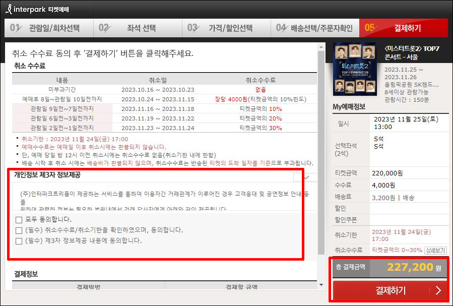 ⑦ 취소 수수료 확인 → 개인정보 제공 "모두 체크" → 결제하기