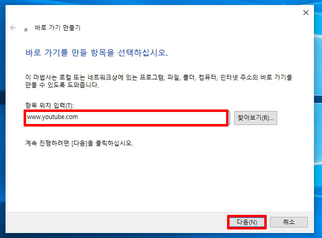 ② 바로 가기 항목 페이지에서 유튜브 사이트 주소를 적는다 → www.youtube.com → 다음